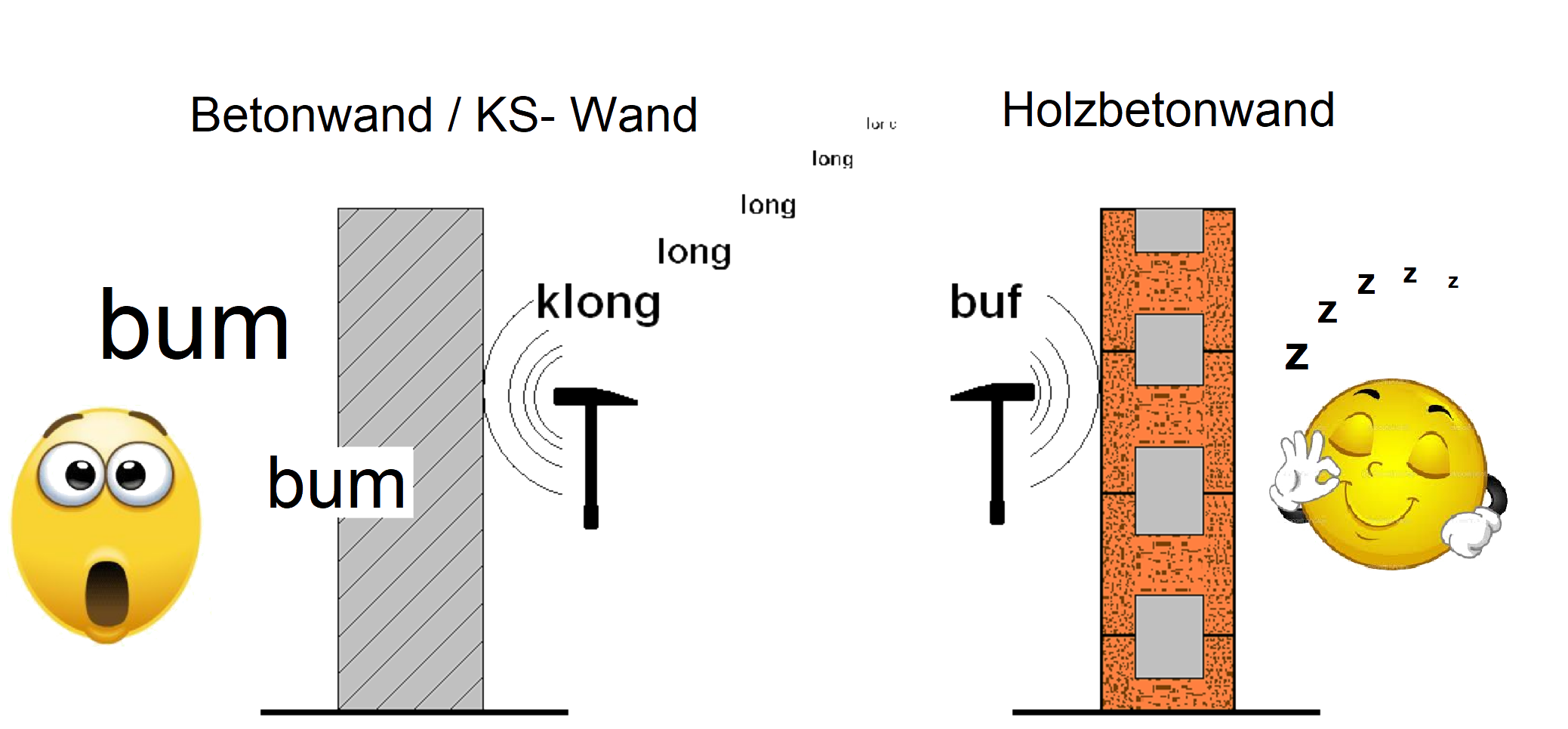 Der hohe Anteil von etwa 80 % Holzspäne im Baustoff Holzbeton wirkt zusätzlich für Microporen in denen sich der aufkommende Schall nochmals im Mikrokosmos verzweigen kann.