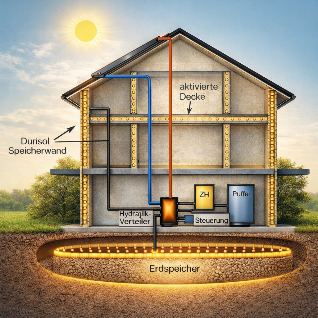 Der Betonkern der Durisol-Wand wird mittig mit Rohrleitungen, wie sie auch bei der Fußbodenheizung zum Einsatz kommen, versehen. Diese Leitungen werden direkt, immer dann vom Sonnenkollektor beladen, wenn Boiler oder Pufferspeicher nichts mehr aufnehmen können, bzw. wenn die Temperatur vom Kollektor nicht mehr ausreicht um den Boiler oder Pufferspeicher zu beladen. Mit der Durisol-Speicherwand kann auch bei einer niedrigen Kollektortemperatur von zum Beispiel nur 25°C noch sehr viel nützliche Wärme ins Haus gespeichert werden. Die Wände bzw. das ganze Haus wirken dann wie ein Kachelofen d.h.: die gespeicherte Wärme wird über viele Stunden, entsprechend über den Tag/Nacht Rhythmus, abgegeben