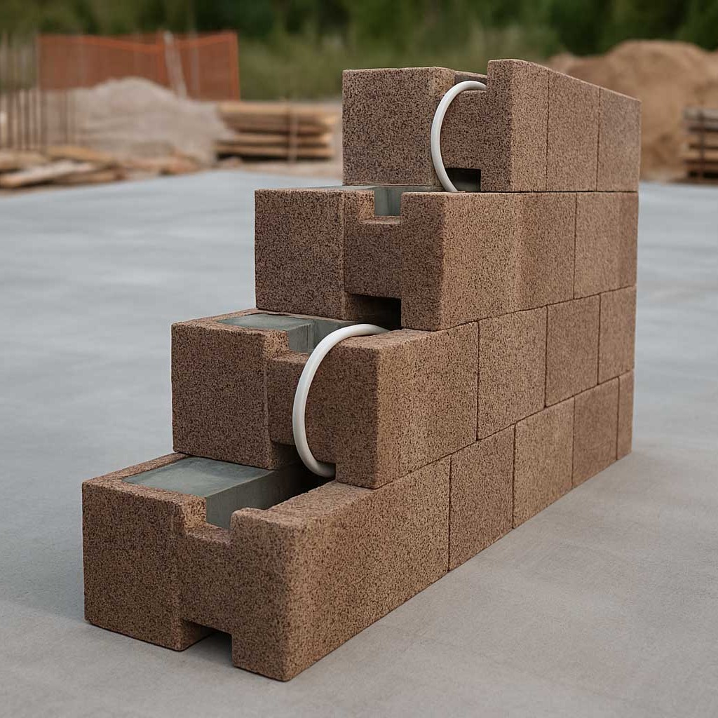 Der mögliche Zuschnitt der Holzspanstein- Schalungselemente mittels einer einmal angefertigten Schablone lässt sich fast jeder gewünschte Wandradius in einem Arbeitsgang herstellen. Auch hier gibt es weder Wärmebrücken noch Tragfähigkeitsverluste oder Gefahr durch Schimmelbildung.